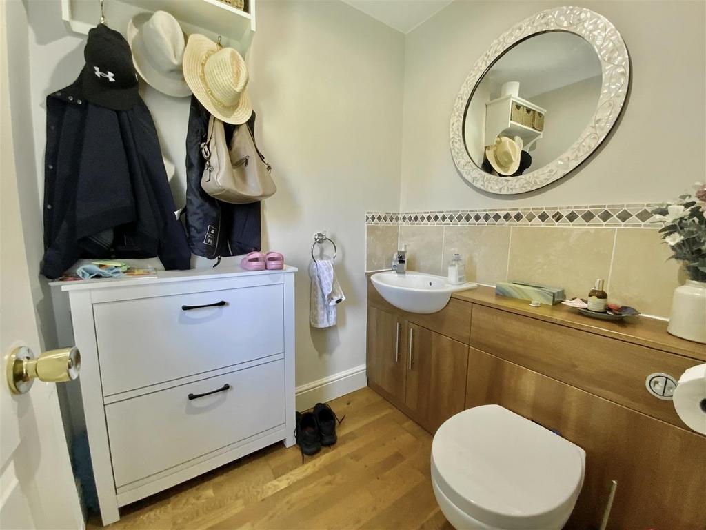 A spacious cloakroom has a WC and wash basin built into a vanity unit, a window to the front and plenty of space for hanging coats and storage.
