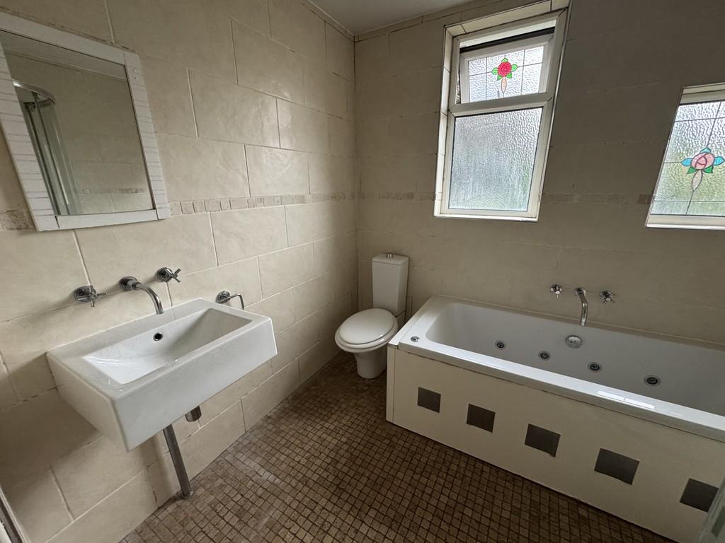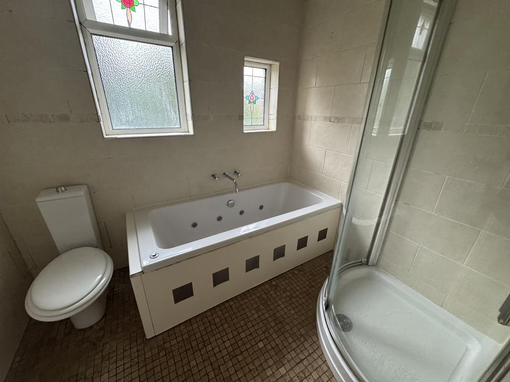 Neutral decor, partially tiled walls, white four piece bathroom suite including shower and jacuzzi bath, 2 x UPVC window, radiator