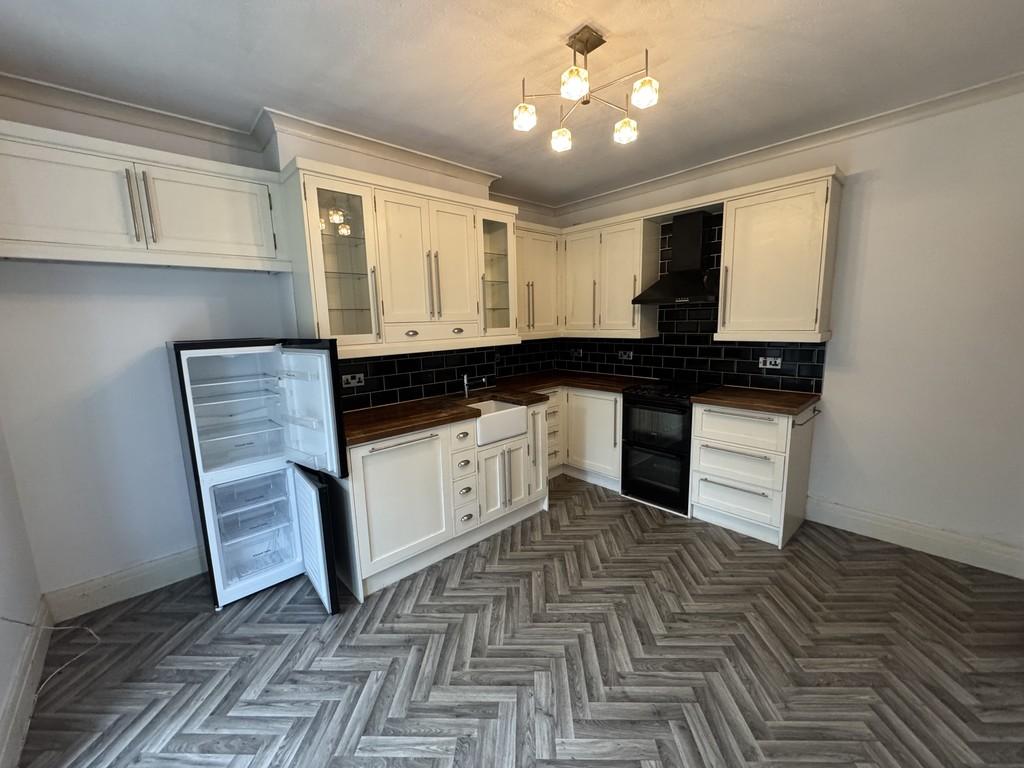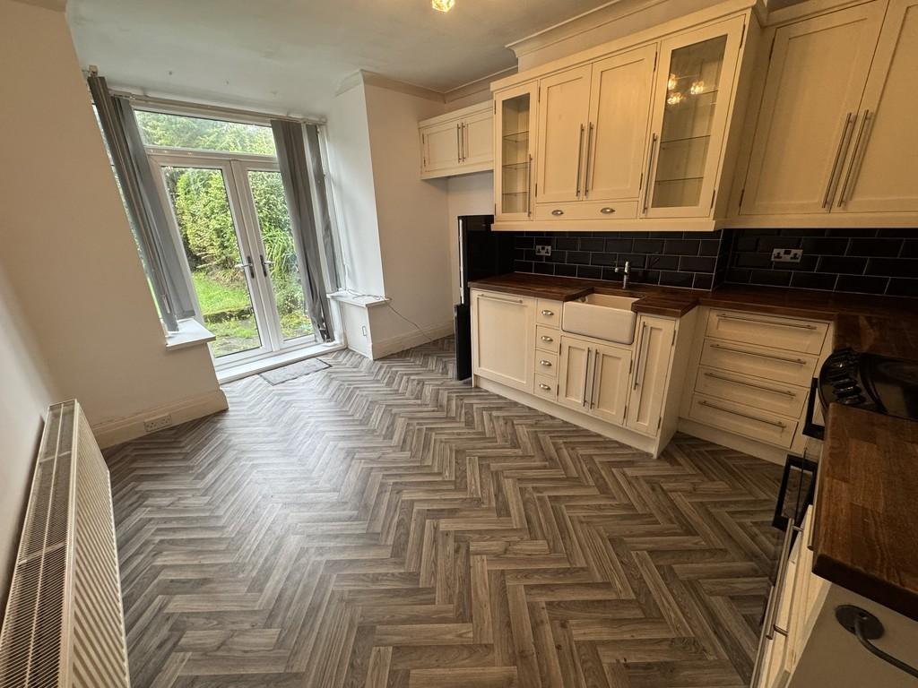 Neutral decor, a range of wall and base units, electric oven, belfast sink, vinyl flooring, UPVC French Doors, radiator