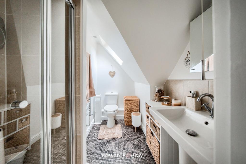 Fitted with a white suite comprising of enclosed shower cubicle, pedestal wash hand basin and low flush w.c. Tiling to splash, heated towel rail, spot lighting and 'Velux' style window.