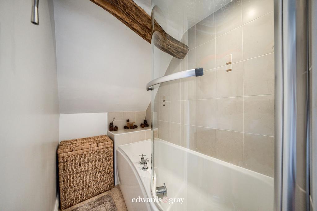 Fitted with a white suite comprising of panelled 'P' shaped bath with shower and fitted screen over. Vanity wash hand basin and low flush w.c. Tiling to splash back, wooden beams and spot lighting to the ceiling, heated towel rail and UPVC double glazed window over looking the front aspect.