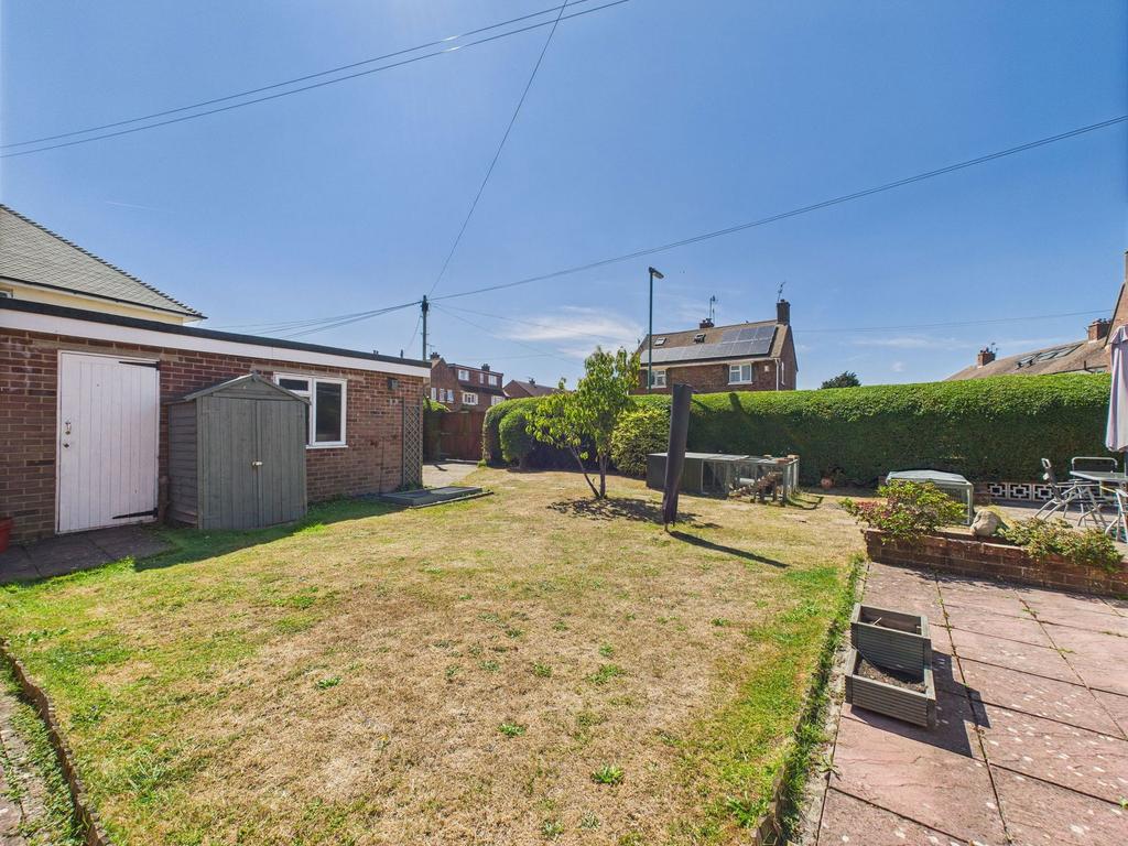 SOUTH FACING REAR GARDEN Large paved patio area leading on to large lawned area raised flower bed with various shrubs, timber built shed, door to garage, gate to side access. Being fence, brick wall and privet enclosed.