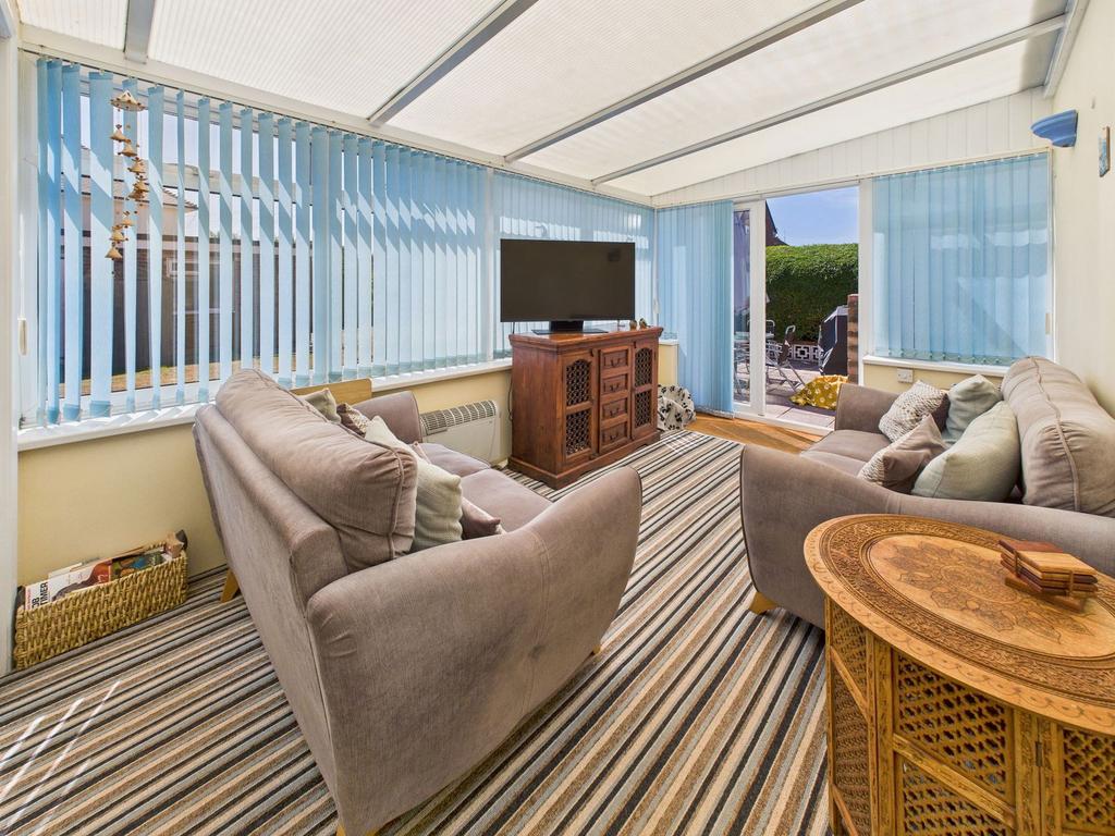 DOUBLE ASPECT SUN ROOM South and West aspect. Comprising pvcu double glazed windows, carpeted flooring, two wall lights, double glazed double doors out to rear garden, doors into:-
