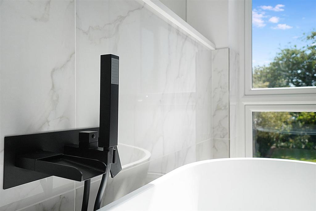 Family Bathroom - 3.91m x 2.45m (12'9" x 8'0") - Double glazed window to rear. Suite comprising slipper bath, shower cubicle with mains fed shower unit, low level WC and vanity unit with inset sink unit. Heated towel rail.