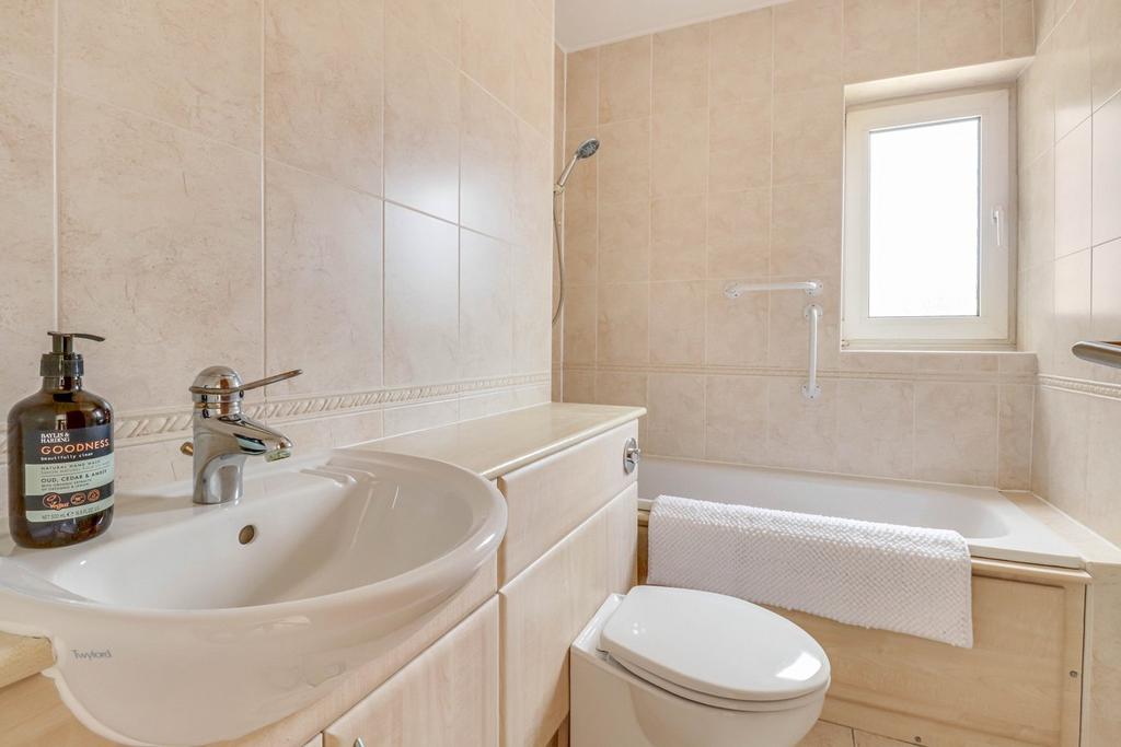 A fully tiled room comprising bath with shower above, low level W.C. with concealed cistern and a wash hand basin set in large storage unit. Obscured double glazed window to side aspect.