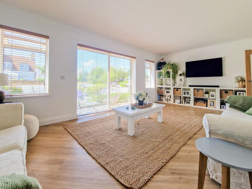 The spacious lounge is filled with natural light and features doors that open onto a south facing garden, creating a seamless indoor-outdoor flow. This bright and airy room is an inviting space for relaxation or social gatherings.
