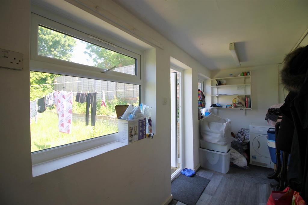 Space for freestanding fridge freezer, space and plumbing for washing machine, vinyl flooring, window and door leading to garden.