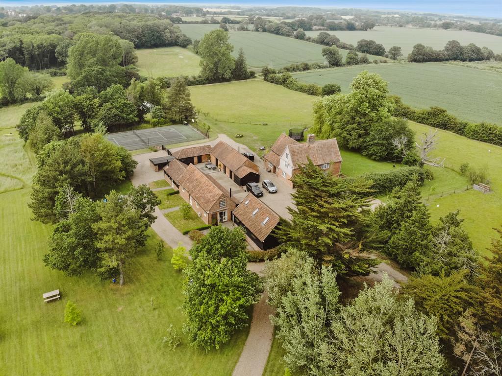 Offered with no onward chain and nestled within just under ten acres of breathtaking countryside, this exceptional and secluded property enjoys complete privacy. It comprises a beautiful three-storey period house and a well-established luxury self-catering business. The main house is rich in period character, it boasts two reception rooms, an elegant kitchen with breakfast area, six bedrooms, one en-suite, two bathrooms, and ample storage. The large garden provides a delightful outdoor space for relaxation. In addition to the main residence, the property includes two self-contained residential units, a detached two-storey cart lodge, and an L-shaped outbuilding that wraps around a charming courtyard. Situated in the sought-after village of Bramfield positioned between Halesworth and Darsham and close to the stunning Heritage Coast and RSPB Minsmere. Conveniently located near the A12, with train services from Darsham to Ipswich and onward to London Liverpool Street, it offers both acces