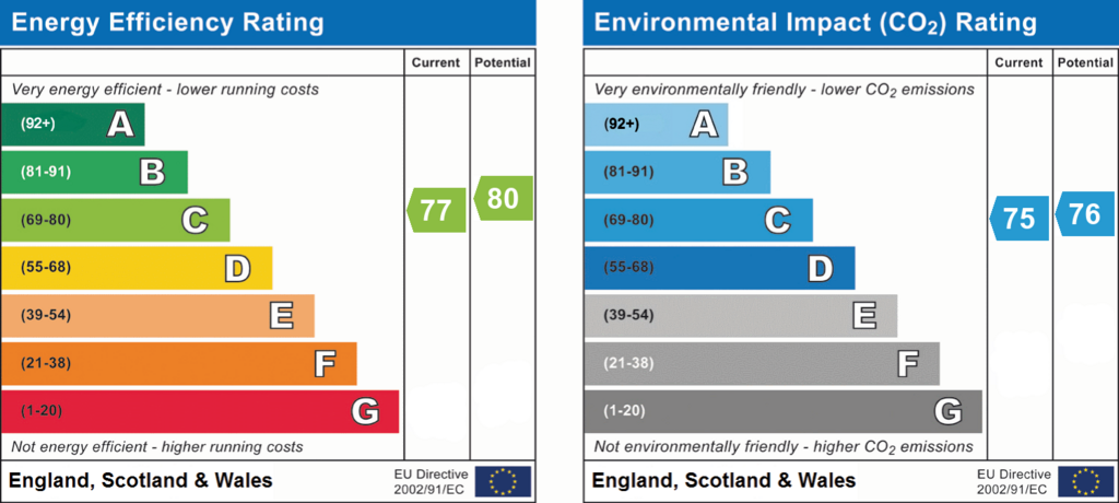 Upstairs, the bright landing is enhanced by a skylight, creating an airy, light filled space. The principal bedroom is generously proportioned and can easily host a king size bed, with two fitted wardrobes featuring made to measure mirrored sliding doors. A stylish three piece en suite with a standing shower and splashback tiling completes the suite. Bedroom two is currently set up as an office but offers fantastic versatility. With double aspect windows and space for a king size bed, fitted wardrobe, chest of drawers and bedside cabinets, it is ideal as a guest room or second principal bedroom. Bedroom three is also a great size and can host a double bed along with additional furnishings, making it perfect for children, guests, or even a dressing room.