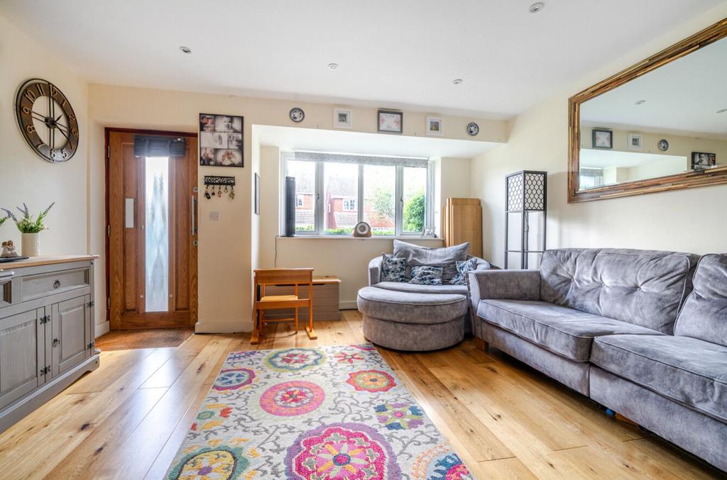 On the ground floor, the home features a formal sitting room at the front, providing a welcoming space for relaxation or entertaining. An inner hallway leads to a useful cloakroom/WC, while to the rear, a bright and spacious kitchen/family room forms the heart of the home. This open-plan area includes a comprehensive range of floor and wall units, an integrated double oven and ceramic hob and wide French doors that open directly onto the south-facing garden, flooding the room with natural light.