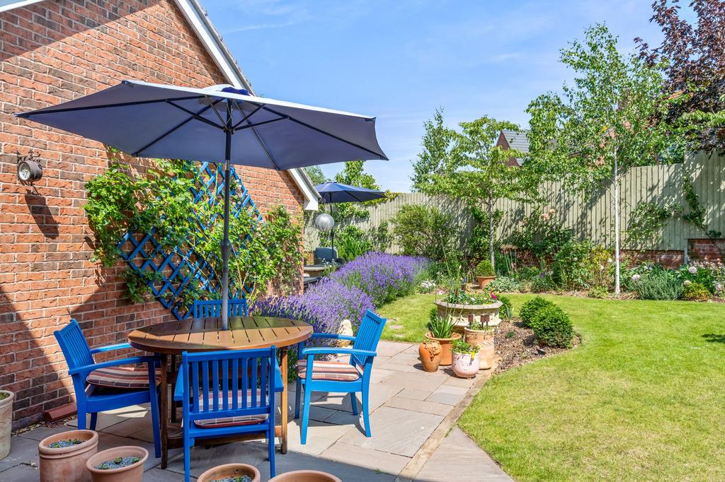 The garden has been thoughtfully designed, with a ‘sun-trap’ south facing seating area, tucked away to the rear of the garage. There are paved terrace areas and the boundary at the rear is screened with attractive mature flowering trees, that also offer autumnal interest. The flower borders that surround the neatly clipped lawn are well stocked with perennials, scented roses and flowering climbers.