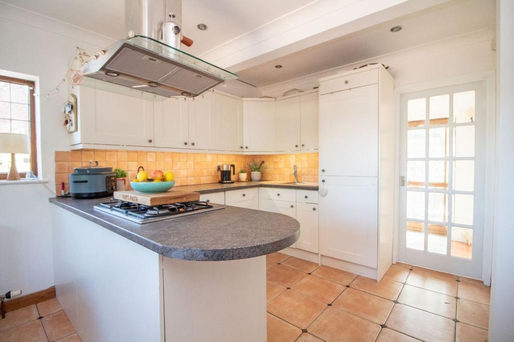 Matching range of wall and base units complemented with work surfaces over incorporating 1½ bowl stainless steel sink unit with mixer tap and drainer, stainless steel 5 ring gas hob with extractor canopy over and electric oven below, space for freestanding 'American' style fridge / freezer, space for table and chairs, radiator, double glazed lead light effect windows to front and side aspects, tiled flooring and to principle areas, smoothed and coved ceiling with pin spot downlighting.