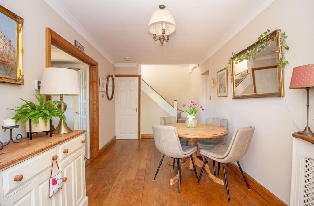 Stairs to the first floor, wood flooring, radiator, double doors to the kitchen / dining room, door to lounge, coved and smoothed ceiling.