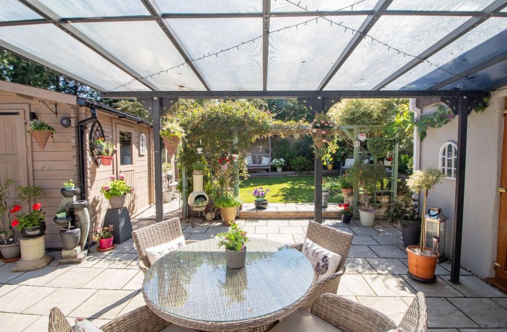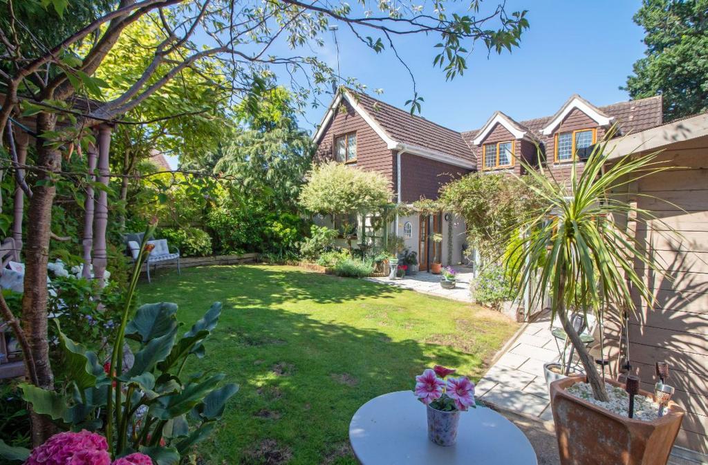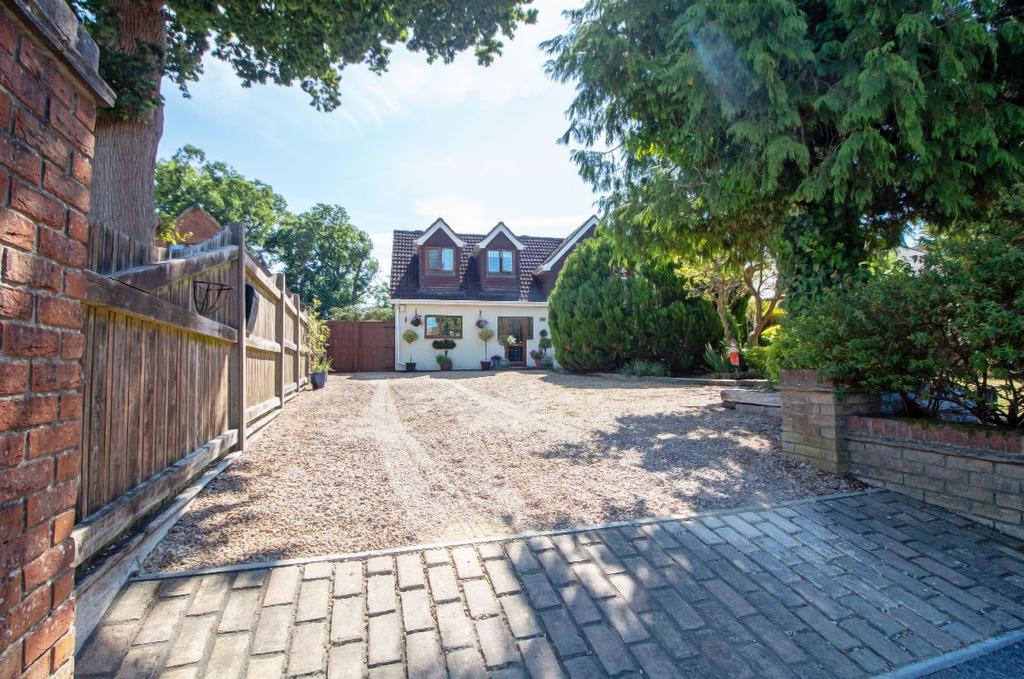 The generous sized shingled frontage providing extensive off road parking for multiple vehicles with double gated access leading to the detached timber garage / cabin which benefits from power and lighting. The rear garden boasts covered extensive patio / seating area stretching full the width of the property with additional patio down the side to the front. Trellised partitioning with mature planting leads to the tended lawn. Raised tended borders and panelled fencing complement the side and rear boundaries.