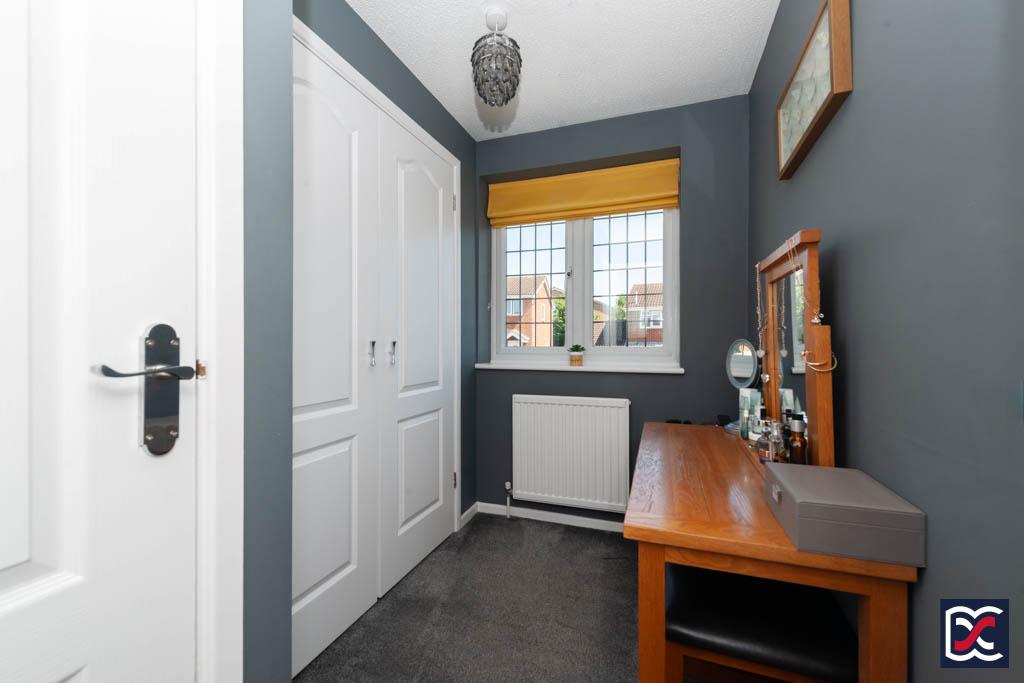Originally designed as a single bedroom or study, this room has been thoughtfully adapted by the current owners to create a functional dressing room. It features a large two-door wardrobe with full-height shelving and double clothes rails, as well as a single-door over-stairs wardrobe with fitted shelving. The floor is finished with cut-pile carpet, and a two-unit window to the front aspect provides natural light.