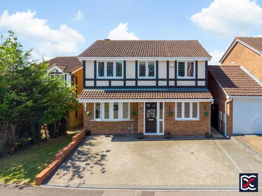 The house is set back from the road behind a large block-paved driveway and presents an appealing façade, with a segmental bay window, full-width canopy, and first-floor mock-Tudor panelling. Internally, the accommodation includes four bedrooms, two reception rooms, and a spacious kitchen and dining area forming the hub of the home. The principal bedroom benefits from an en suite, and there is a separate family bathroom and ground floor cloakroom.