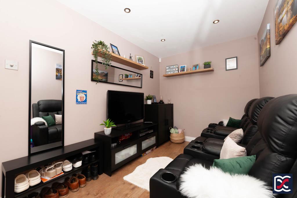 A versatile living space currently arranged as a family snug and cinema room, with a three-unit casement window to the front aspect. The walls are neutrally decorated, and the floor is finished with oak-effect timber laminate boards. Artificial lighting is provided by evenly spaced recessed spotlights.