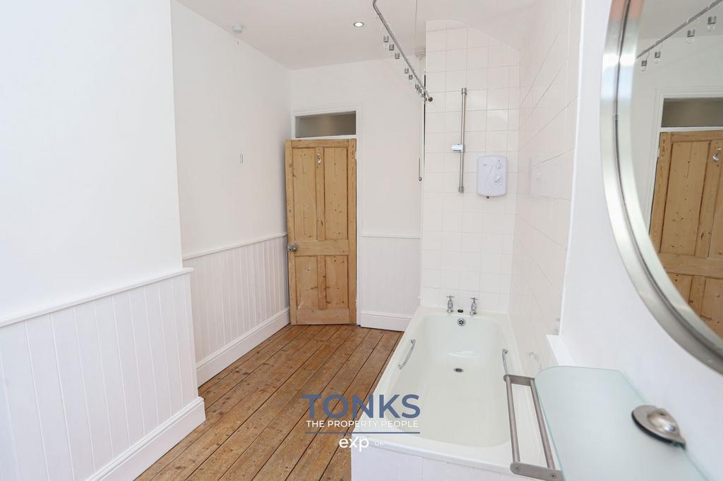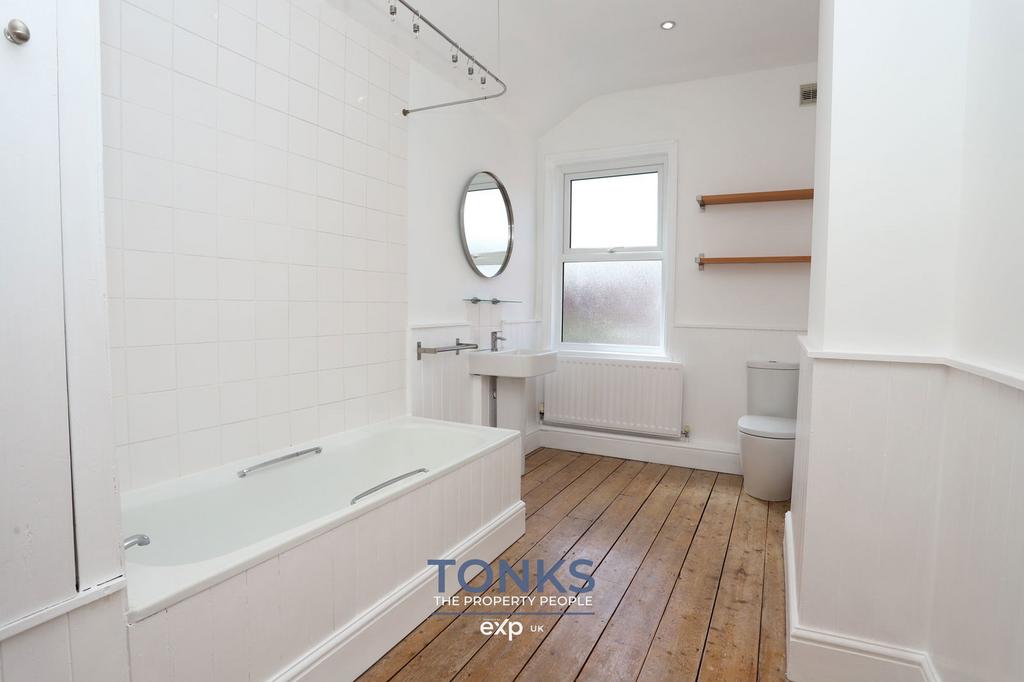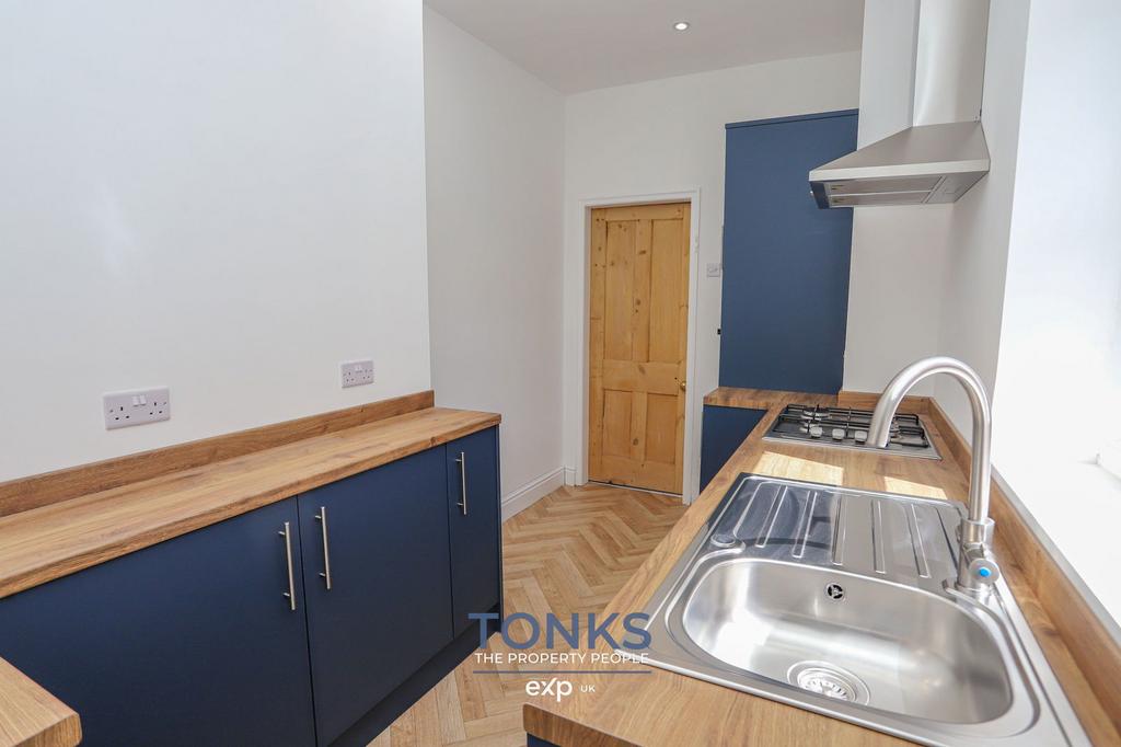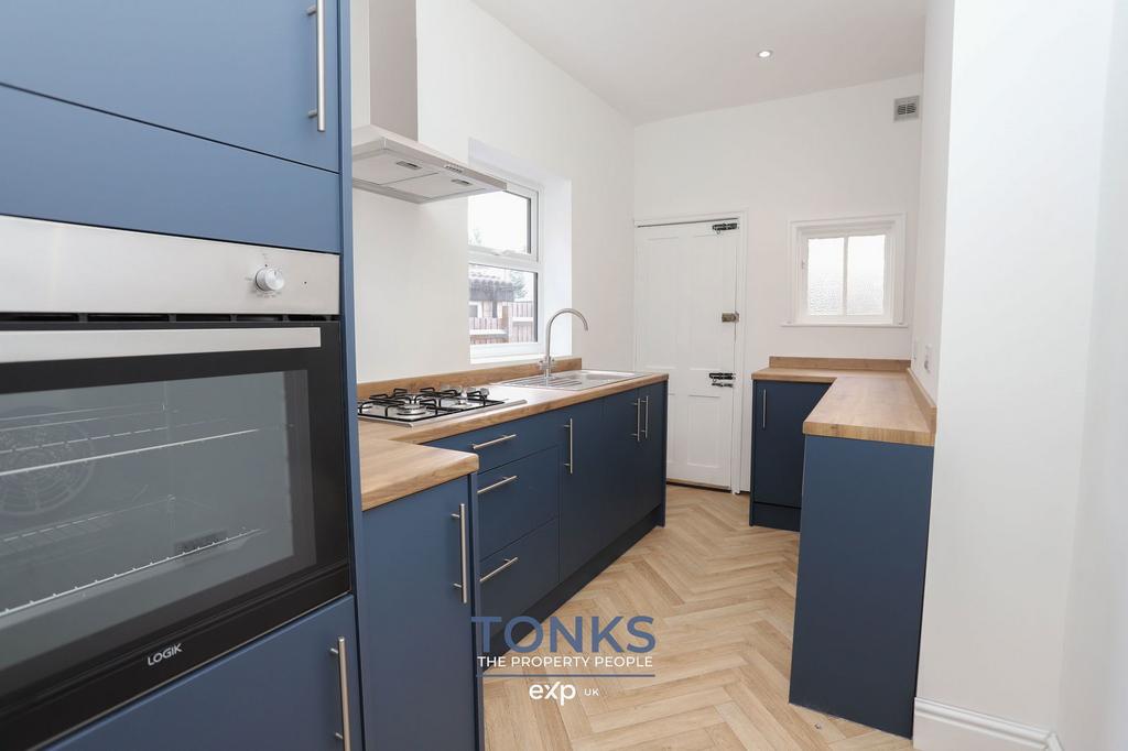 The ground floor comprises two generous reception rooms, both featuring attractive period fireplaces and characteristic bay windows that add such charm to these Victorian homes. The brand new kitchen is a particular highlight, boasting stylish navy units, wooden worktops, and integrated appliances that combine functionality with contemporary design.