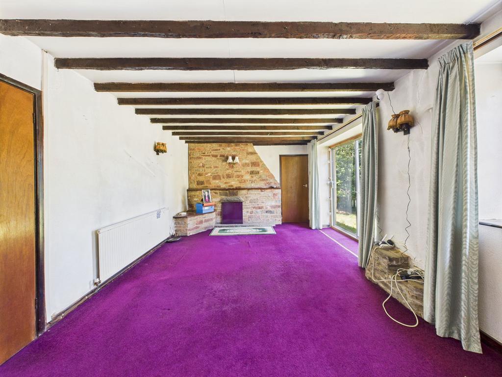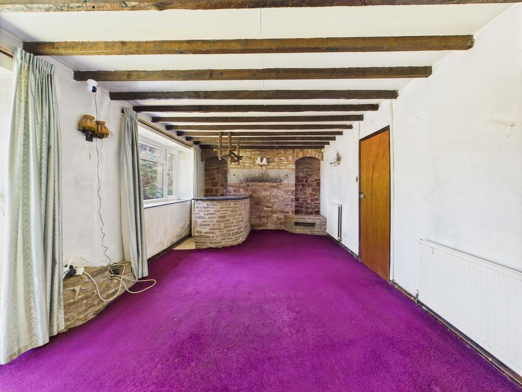 The living room is a wonderfully characterful space with striking original features and plenty of natural light. Exposed ceiling beams run the full length of the room, drawing the eye and adding a sense of rustic charm and historic depth to the space. A rich, purple carpet brings a unique vibrancy, but the room’s generous proportions and neutral walls provide an ideal canvas for redecoration in a style of your choosing. At one end of the room, a full-height stone fireplace becomes the natural focal point- offering potential to install a wood-burning stove or create a cosy reading nook. Opposite this, an equally charming stone-built bar area evokes entertaining possibilities and adds to the unique personality of the space. Natural light floods the room through sliding glass doors and an adjacent large window, both overlooking the front aspect and garden. A door to one end leads back to the hallway, ensuring good flow through the home, while the overall scale of the room allows flexibility for a variety of furniture arrangements.