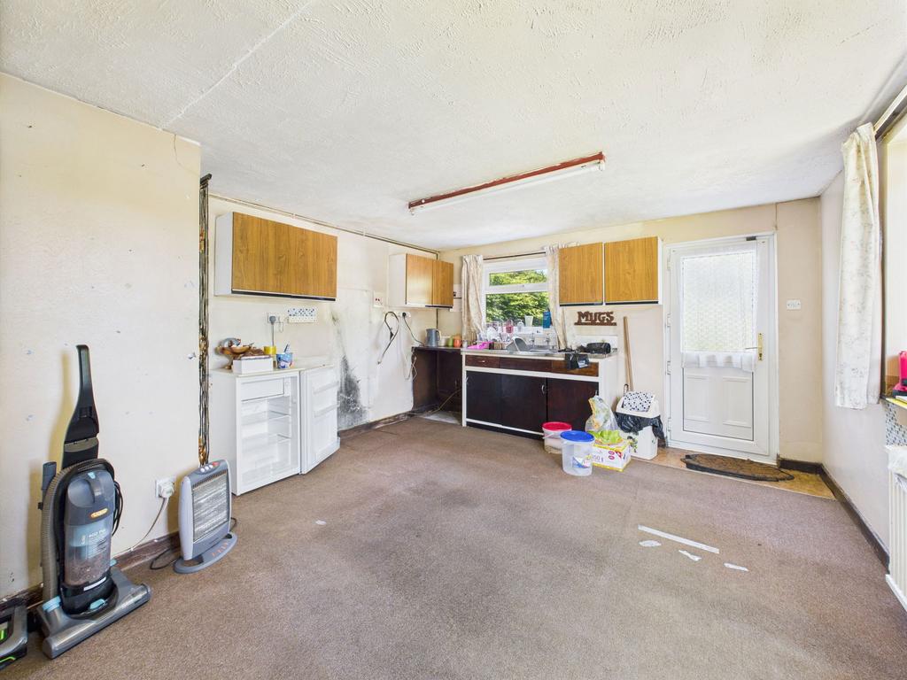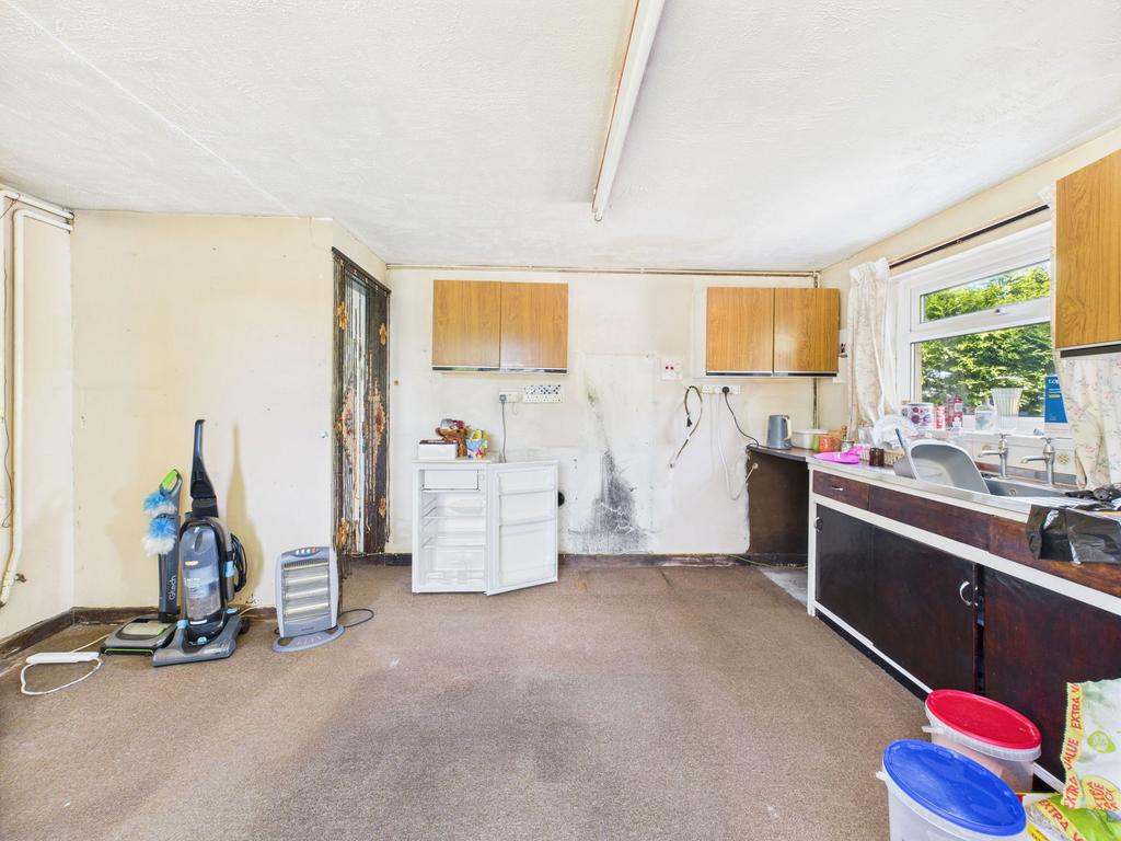 Stepping in to the kitchen space, while in need of refurbishment, offers excellent potential thanks to its generous proportions and natural light from multiple aspects. A large window to the front frames leafy greenery, while a second window above the sink provides a side aspect view, creating a dual-aspect environment that brightens the room throughout the day. A glazed door to the side adds further light and provides easy access to the exterior, ideal for summer evenings or practical day-to-day use. The room also benefits from a useful connection to two further spaces: a door to the rear opens into a utility/store room, which includes its own window to the rear aspect, offering the opportunity for a separate laundry space or pantry. Meanwhile, a door to the opposite side leads through to the main living room, making the space sociable and functional for everyday family life or entertaining.