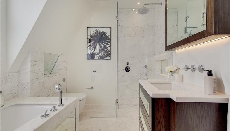 The primary bedroom has a range of built-in wardrobes, a full marble en suite bathroom with underfloor heating, mirror-fronted cabinet units with integrated demister, and a door leading to the private courtyard. The second bedroom also offers a range of built-in wardrobes and an en suite marble shower room.
