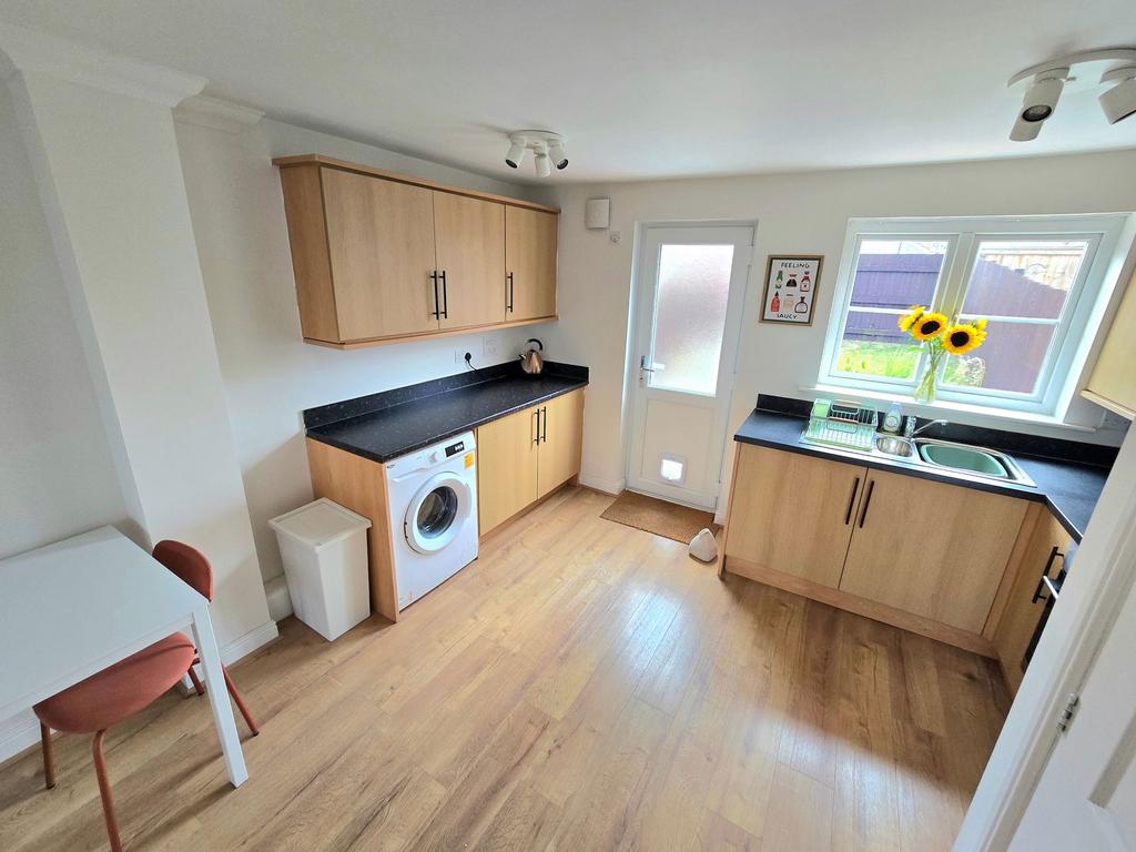 Upvc double glazed window and door to rear. Fitted with a range of wall and base units incorporating stainless steel one and a half bowl sink unit. Built-in stainless steel electric oven with gas hob, stainless steel splash back and stainless steel extractor chimney over. Integrated fridge and freezer. Wall mounted gas combination boiler in cabinet. Radiator. Laminate flooring. Extractor fan.