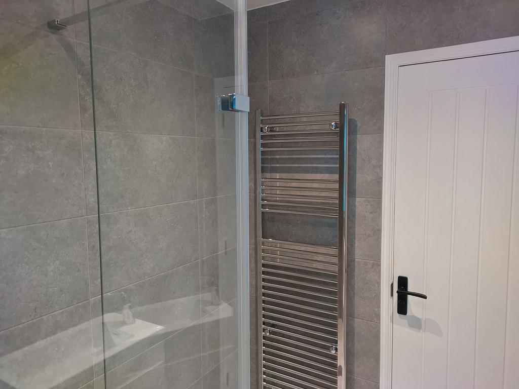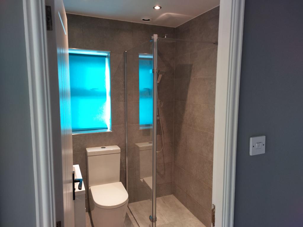 A modern shower room fitted within the last 18 months. Comprising of a three-piece suite in the form of; low flush W.C, basin sat within vanity unit with chrome mixer tap over and walk in shower with waterfall shower over with separate hand held attachment. The room has full tiling to walls and floor, inset ceiling spotlights, extractor fan, chrome towel rail / radiator and obscure uPVC double glazed window.