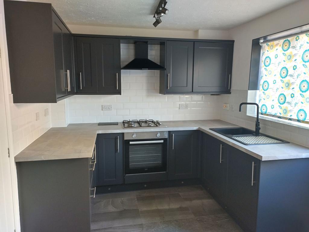 A modern kitchen fitted within the last 18 months. The kitchen itself has a range of wall and base units in grey shaker style with a marble effect and contrasting laminate worktops over. Integrated electric oven with four burner gas hob over with tiled splashback and chimney style extractor fan over. The kitchen has inset ceiling spotlights, uPVC double glazed window, part tiling to walls, tiling to floor and black sink with black mixer tap over. The dining area has ample room for dining furniture, central heating radiator, twin French doors in uPVC giving access to rear garden and access to under stairs storage cupboard.