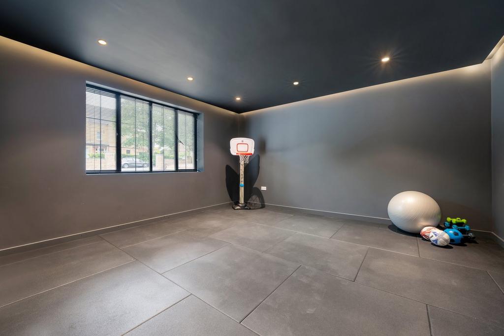 4.73m x 4.68m (15' 6" x 15' 4") Double glazed leaded light front window, recessed ceiling downlights, commercial grade gym flooring (could be cinema room)