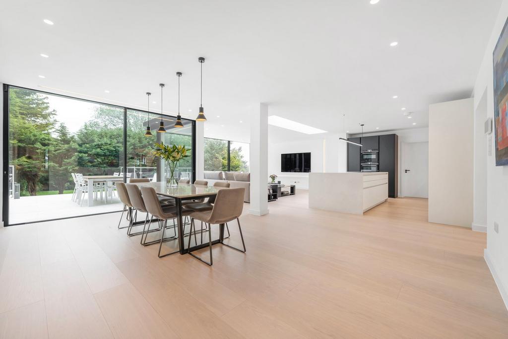 8.42m reducing to 5.78m (19' ) x 9.81m (27' 7" x 32' 2") Fabulous open plan L shape room with a set of floor to ceiling triple and double sliding double glazed doors to rear and two double glazed side windows, Havwoods wide plank engineered wood flooring, recessed downlights, double glazed ceiling lantern, recessed LED lighting, back-lit display for T.V.