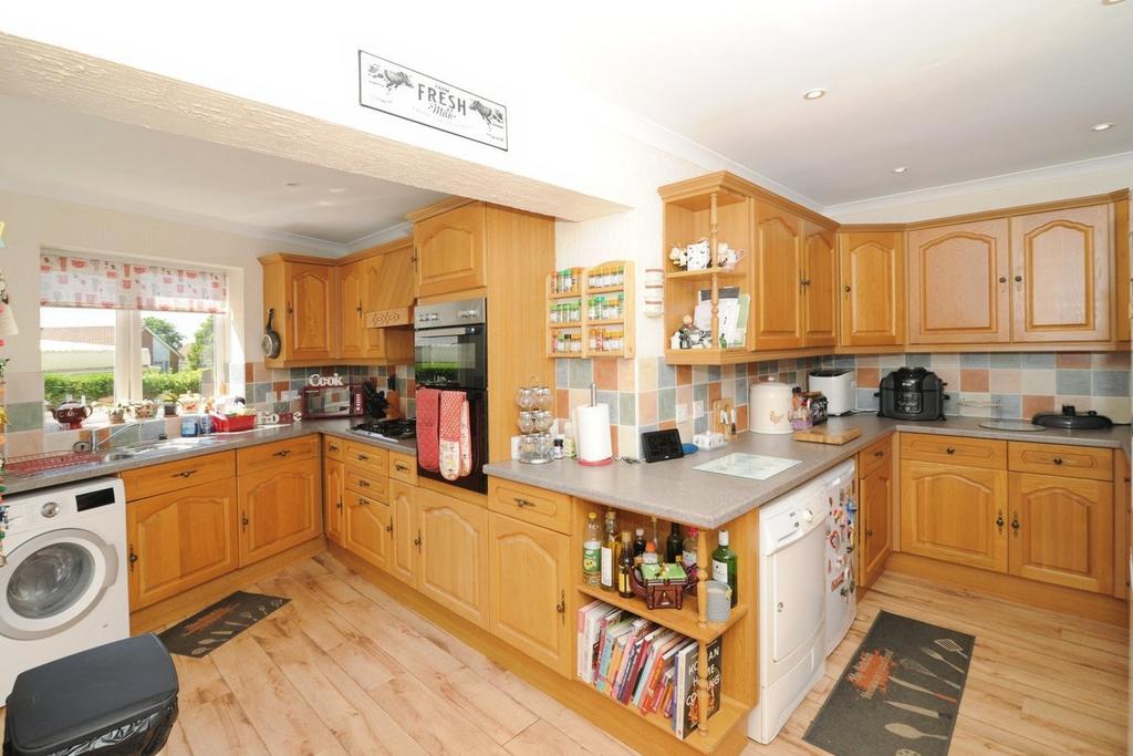 At the heart of the home lies a beautifully appointed kitchen, fitted with a comprehensive range of wall and base units complemented by stylish worktops. Integrated appliances include a gas hob with an extractor hood above, and a built-in oven, with additional space and plumbing available for further appliances. The kitchen also features an inset sink with a mixer tap and drainer, along with a door that provides direct access to the rear garden, making it a highly functional and social space for everyday living.