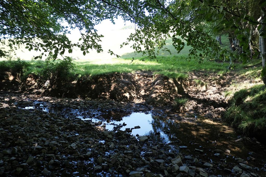 Boundaries: The boundary is open on all sides and marked with orange posts to the west and blue posts the east. North follows the stream and open fields beyond. South follows the main access track.