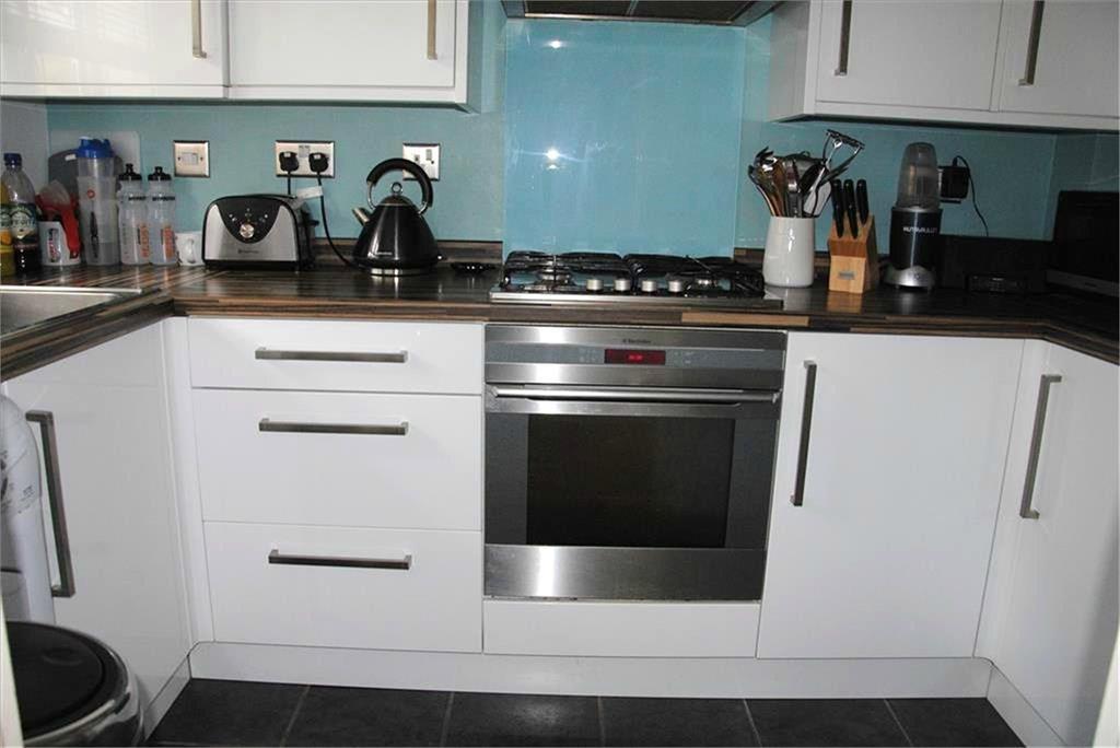 Kitchen - 2.95m x 1.73m - Range of high gloss base and wall mounted units with soft closing drawers and cupboards with work surfaces over incorporating stainless steel sink unit with mixer tap. Washing Machine and Fridge Freezer. Wall mounted boiler. Built-in oven and gas hob with extractor fan over and clear perspex splashback. Tiled floor. Window to front aspect.