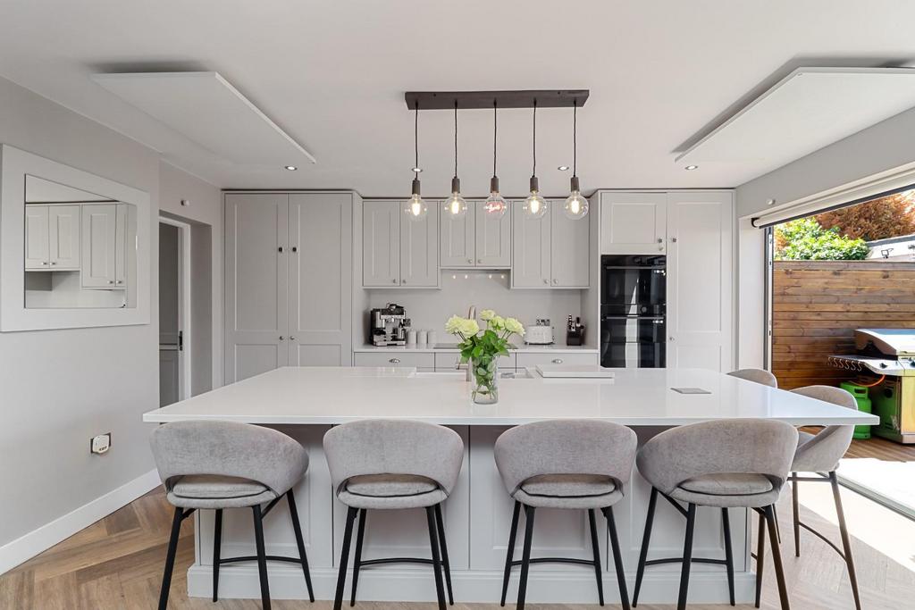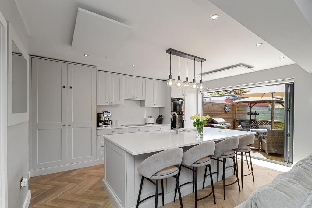 Open Plan Living Diing Kitchen - 7.47m x 6.76m (24'6" x 22'2") - Also accessed via the entrance hallway a superb open plan living space where the kitchen area is fitted with a comprehensive range of grey wall and base units with contrasting quartz work surface over with central island incorporating 1 1/2 bowl enamel sink unit and breakfast bar. Integrated Samsung double oven plus 4 ring induction hob, extractor hood. Integrated fridge, freezer and dishwasher. Ample space for living and dining suites. Bi folding doors to the decked seating area plus PVCu double glazed double doors from the dining area. Two Velux windows to the rear. Infa red heating.