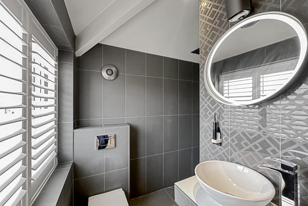 Bathroom - 2.97m x 1.68m (9'9" x 5'6") - Fitted with a contemporary white suite with chrome fittings comprising panelled bath with mixer shower, tiled shower enclosure, wash hand basin and WC. Opaque PVCu double glazed window to the side. Tiled walls and floor. Recessed low voltage lighting. Extractor fan.