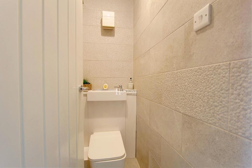 The bathroom is fitted with a modern suite and tiled throughout, offering a separate shower enclosure and wash hand basin. A separate W.C. is finished to match, maintaining the continuity of style.