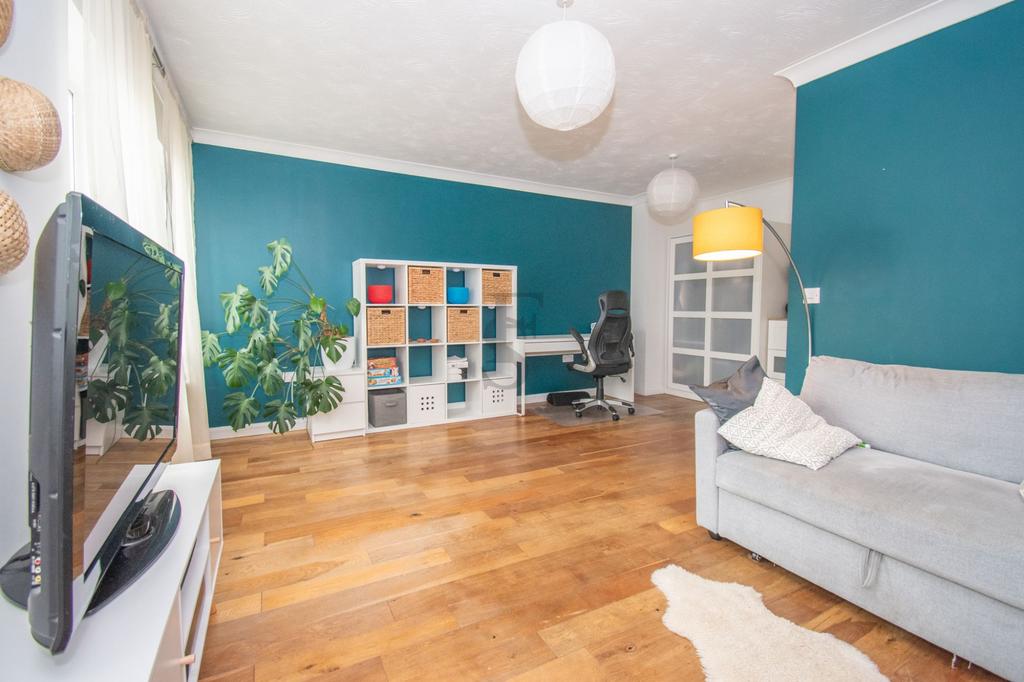 The majority of the first floor is occupied by the great sized living room with three large windows overlooking the front aspect to allow for ample natural light and fresh air to seep into the room. The kitchen has been conveniently fitted with a range of wall mounted and base level units with square edged work surfaces, integrated dishwasher, sink and drainer unit with splash back tiles and window overlooking the rear garden, space for fridge/freezer, gas hob with oven and extractor over. All finished off neatly with space for a dining table and patio doors leading to the rear garden.