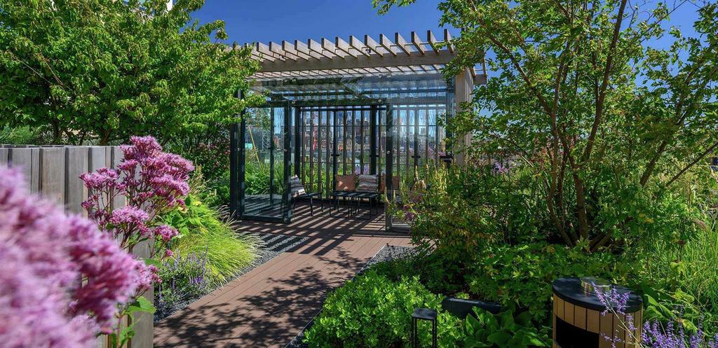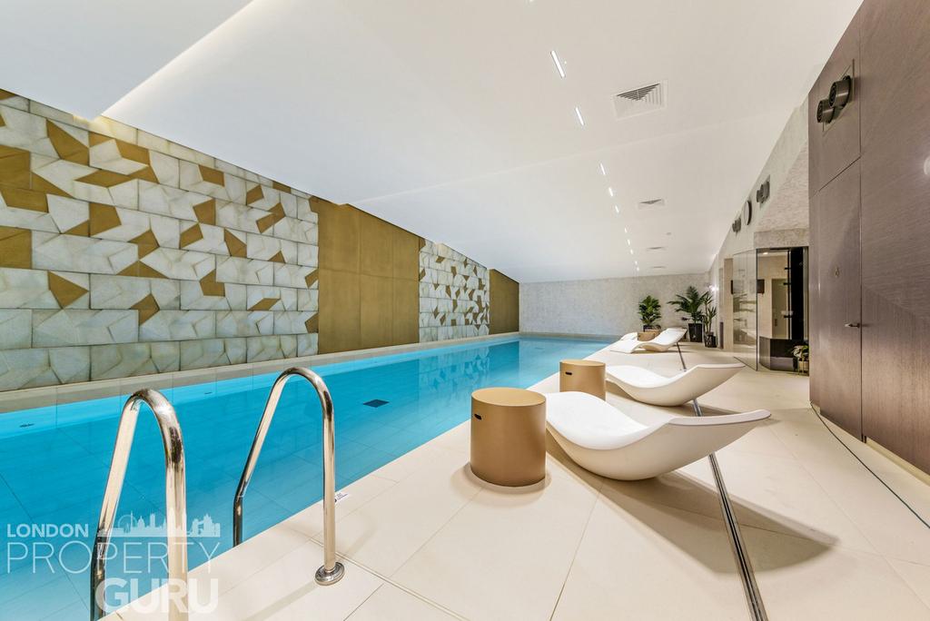 Residents benefit from a world-class range of amenities including a 24-hour concierge, residents-only spa with swimming pool, sauna, steam room, landscaped courtyard gardens, and communal roof terrace.