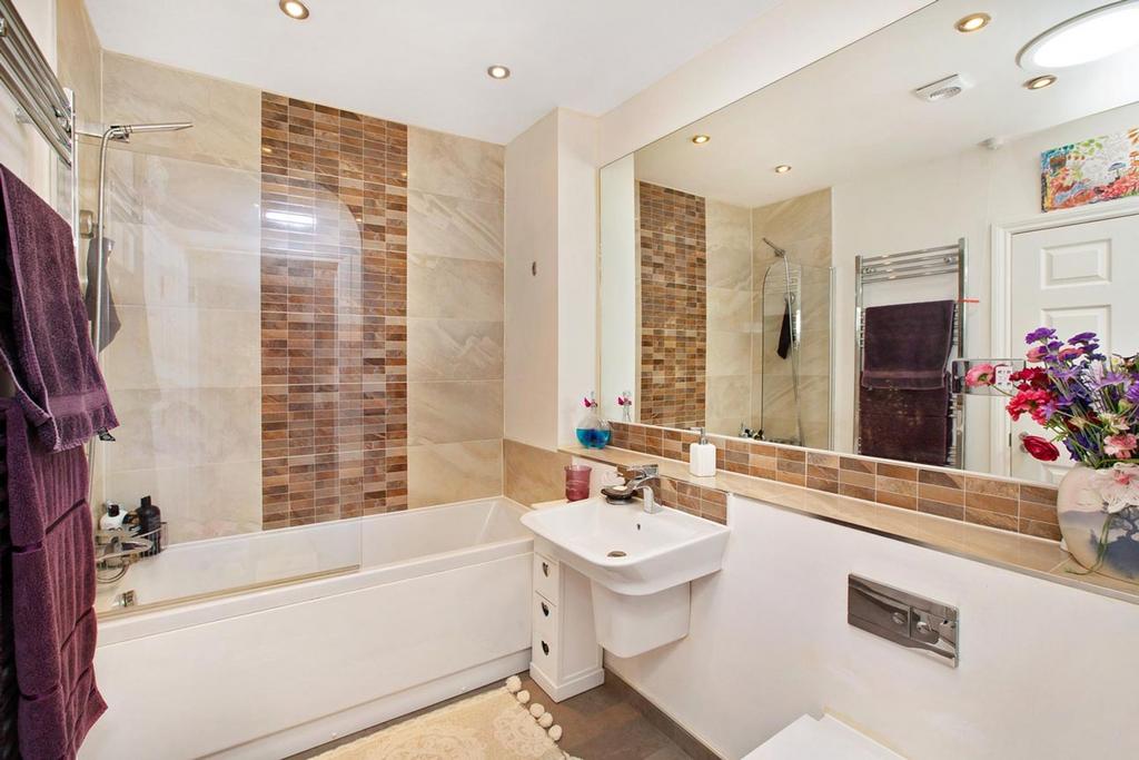 Which also "Jack & Jills" to the reception hall. The bathroom is fitted with a three-piece white suite comprising a panelled bath with beautifully tiled full-height surround and a mixer tap, as well as an attached shower screen, wall mounted Roca wash hand basin and WC. There are feature large floor tiles, a tiled display ledge with large mirror above, spotlights and a light tube to the ceiling. Extractor fan and ladder style radiator/towel rail.