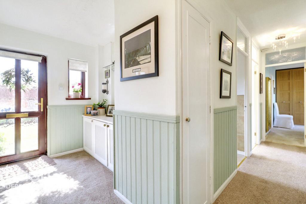 The bungalow opens into a large and welcoming entrance hall, brightened by a UPVC double-glazed front door and window. This inviting space includes built-in storage cupboards, one of which houses the hot water tank and shelving, as well as low-level cabinetry accommodating the broadband router and HIVE smart heating hub. There’s also convenient access to the loft, offering potential for extra storage.