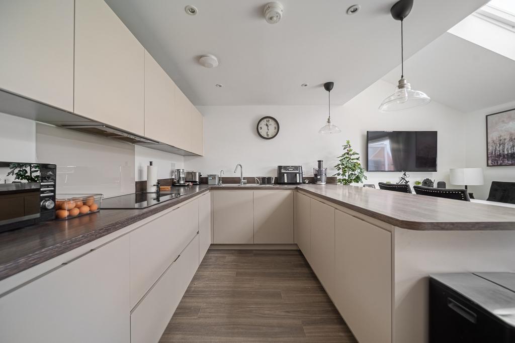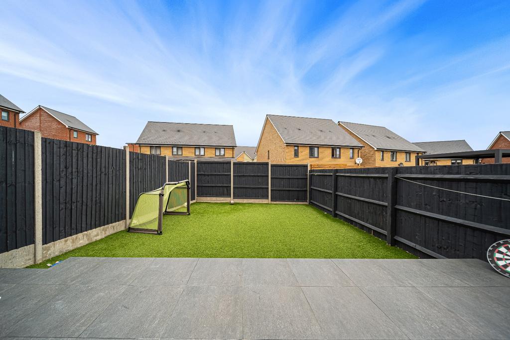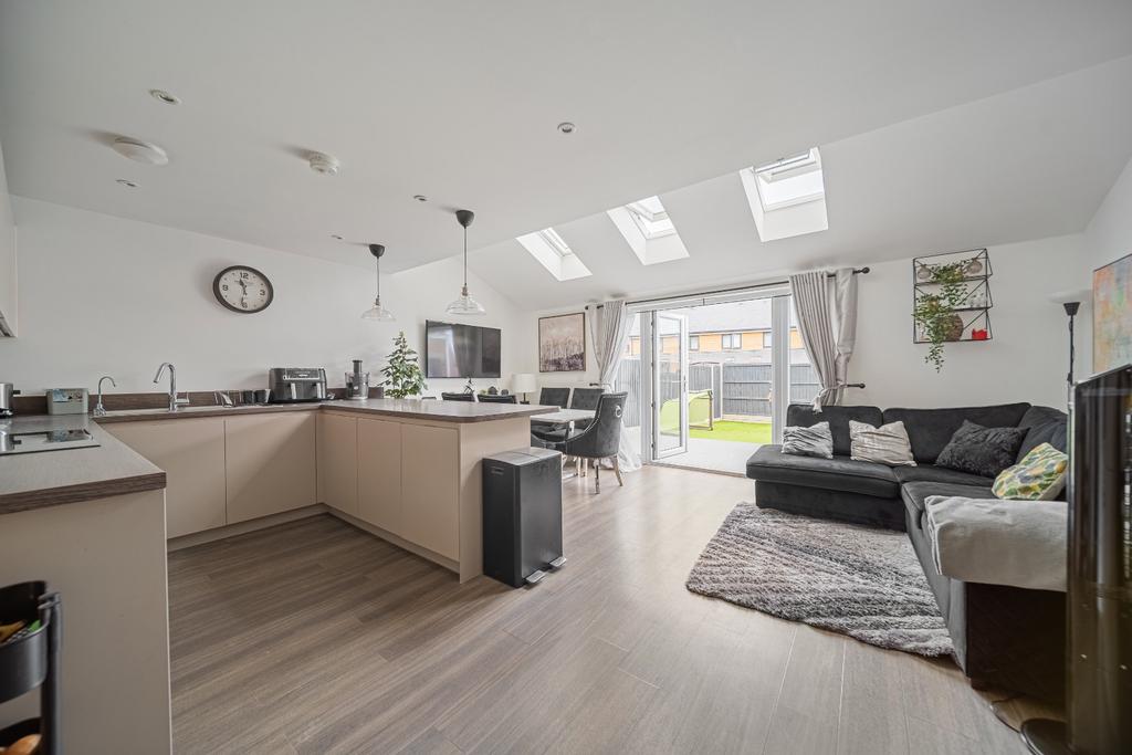 As you step inside, you'll be greeted by a bright and modern finishing. As you make your way to the heart of the home, you'll be impressed by the spacious open-plan kitchen and dining area. Featuring integrated appliances, a pitched roof, and skylights, the space is flooded with natural light—perfect for everyday living and entertaining. French doors lead out onto a raised decking area, seamlessly extending the living space outdoors. The garden has been thoughtfully landscaped with high-quality artificial turf, creating an ideal low-maintenance space for relaxation, entertaining, and a children's play area.