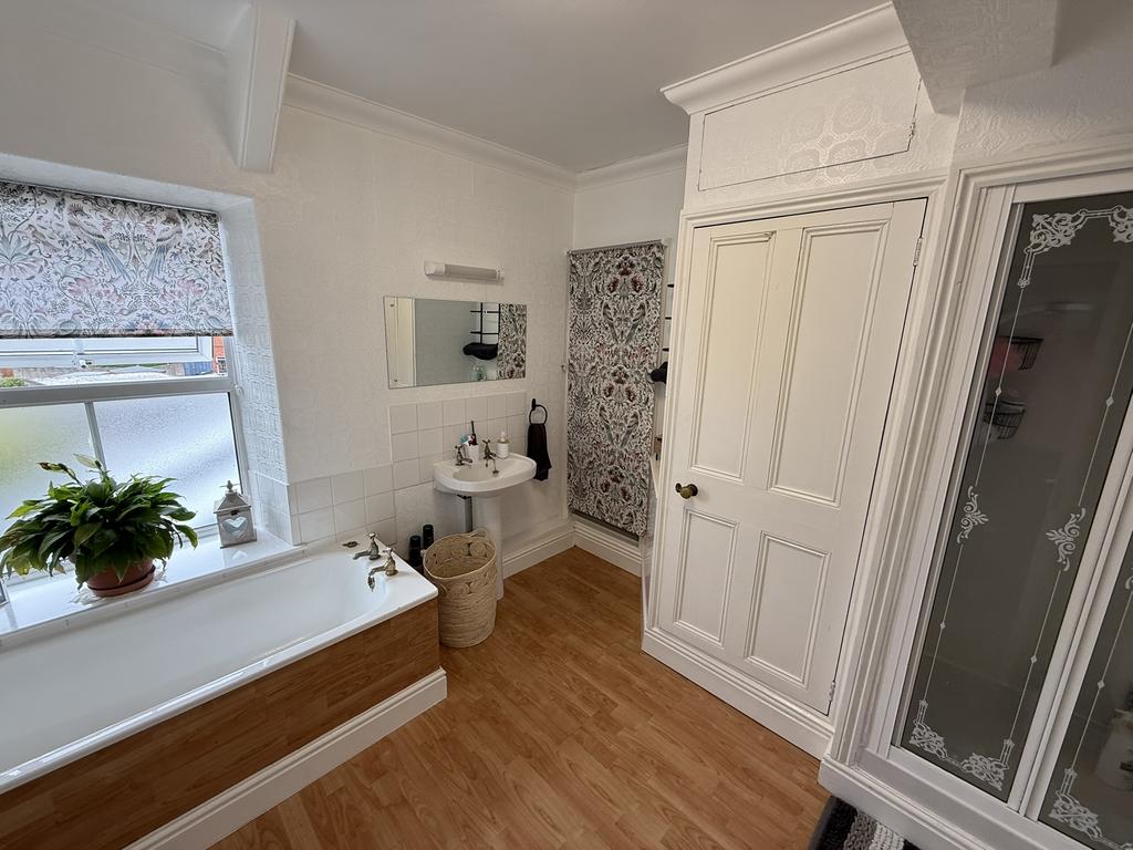 double glazed window to rear, panelled bath, pedestal wash and basin, alcove housing the fitted ‘Ideal Logic’ gas fired central heating boiler, shelved airing cupboard, double radiator and shower cubicle with ‘Mira’ shower and glazed door.