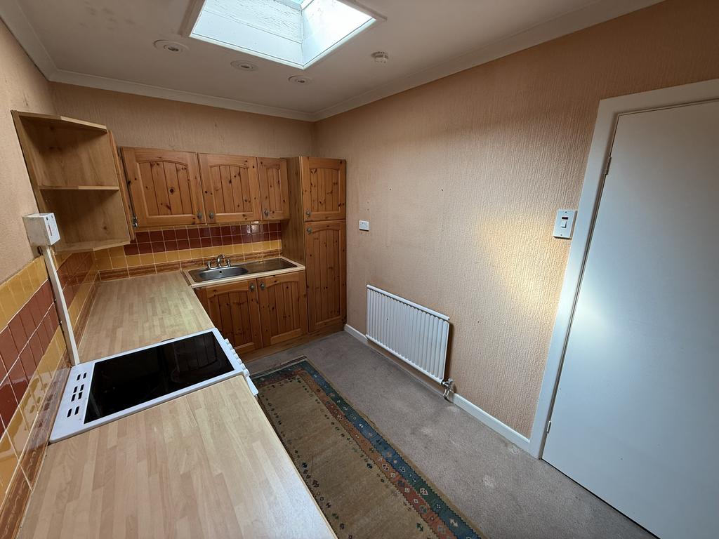 Base and wall units, electric cooker point, single bowl and drainer sink unit, tall unit, appliance space, radiator, skylight and door to:
