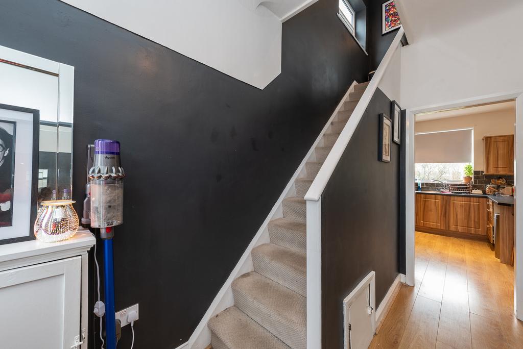 Through UPVC front door into the entrance hallway with wood effect laminate flooring, opaque windows to front aspect, decorative pictures rails, access to living room, kitchen and stairs leading to the first floor.