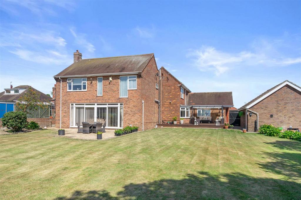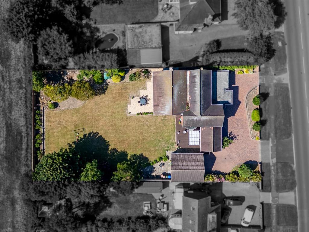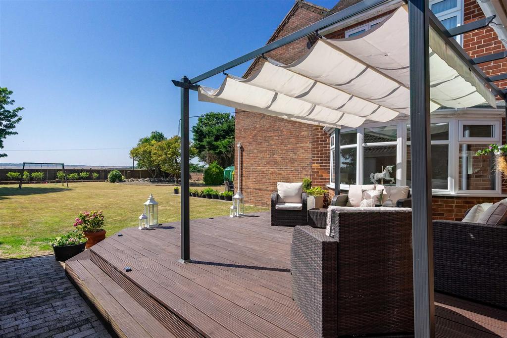 The property is set back from the roadside via a brick paved in and out driveway, providing dual access and off street parking for multiple vehicles, with sweeping borders and a low boundary wall. Access leads to both the integral garage and the standalone double garage with and electric up and over double garage door. Gates lead through into a deceptively large West facing rear garden, laid to lawn but with a feature paved patio area and further elevated decked patio with Pergola. With the rear being enclosed by a mixture of fenced and walled boundaries, with mature trees, planted borders and facing out over opens fields at the rear so as to not be overlooked or overshadowed.