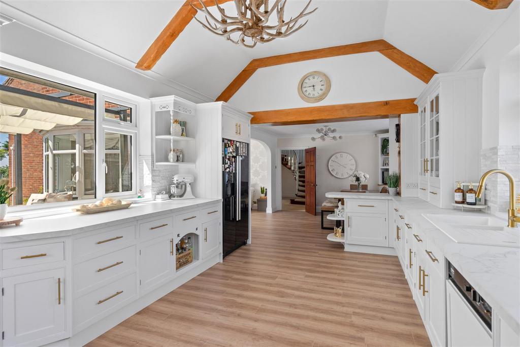 Occupying a very large plot, the west-facing garden overlooks open fields, providing a serene and private outdoor space that is not overlooked. This tranquil setting is perfect for enjoying the evening sun, hosting summer gatherings or providing a great space for children to play. Additionally, the property boasts ample parking for multiple vehicles with a double garage and an in and out driveway to meet a large family's needs.
