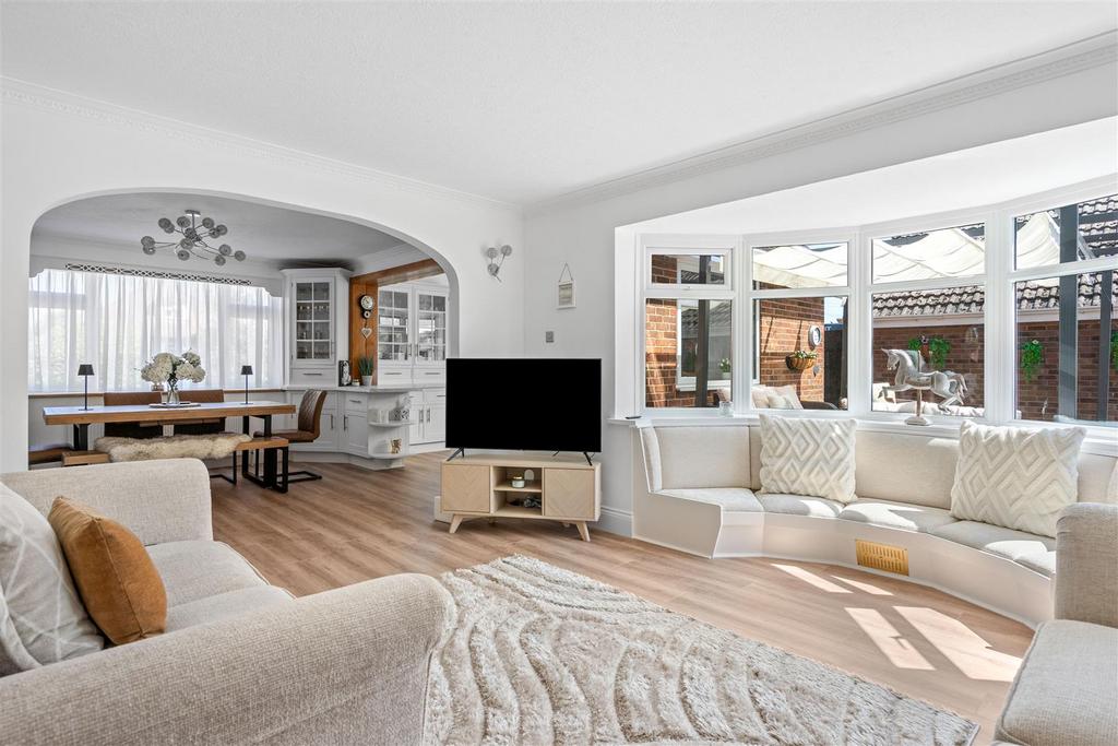 The heart of the home is the open plan kitchen, with a vaulted ceiling and contemporary white units with marbled effect worktops and gold accents, this seamlessly flows through to an open plan dining room and sitting room with window seat to the bay window.