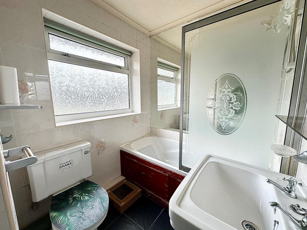 Ceiling light point, double glazed window, bath with shower over, low level WC and a hand wash basin.