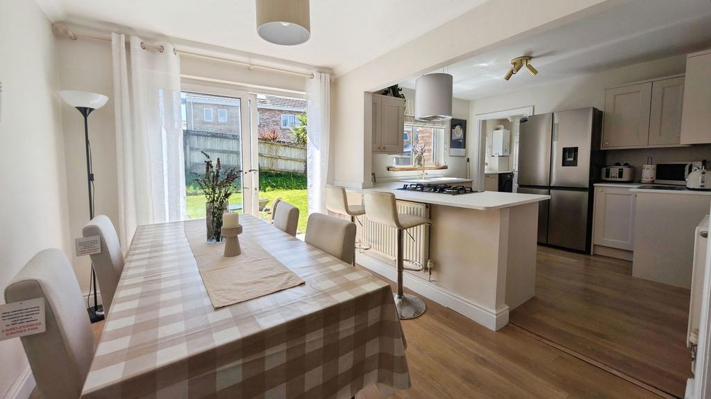 A generous and sociable space with a dining area and a kitchen that includes a breakfast bar and a range of wall and base units with complementary worktops. Features include a one and a half bowl ceramic sink and drainer, electric oven, 5-ring gas hob with extractor hood above, and space for an American-style fridge freezer. Laminate flooring continues throughout, along with a radiator, a double-glazed window to the rear, and sliding doors opening out onto the garden.