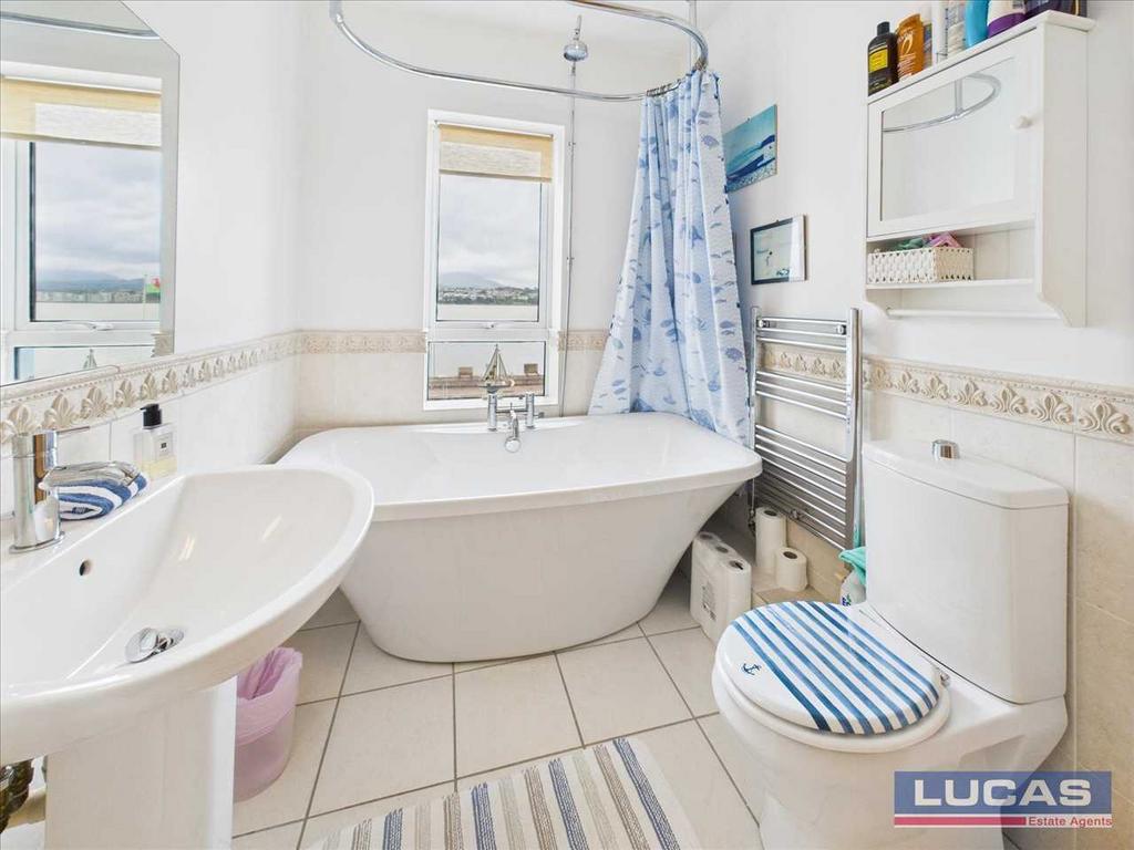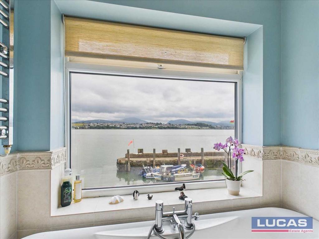 The landing continues with two windows to the front aspect and further doors leading off into bedroom 2 with a window to the rear aspect boasting spectacular panoramic views over the Menai strait,the dry dock,the historic town of Caernarvon with its stunning castle and door off into an en suite bathroom,bedroom 3 with window to front aspect and a window to the rear aspect boasting spectacular panoramic views over the Menai strait,the tidal dock,the historic town of Caernarvon with its stunning castle and door off into en suite and completing the accommodation is a dual accessed en suite for both bedroom 2 and 3 briefly comprising a free standing double edged bath with mixer tap with shower fittings,low flush Wc,pedestal wash hand basin,complementary tiled walls and flooring,extractor fan,chrome heated towel rail and a window above the bath boasting spectacular panoramic views over the Menai strait,the tidal dock,the historic town of Caernarvon with its stunning castle.